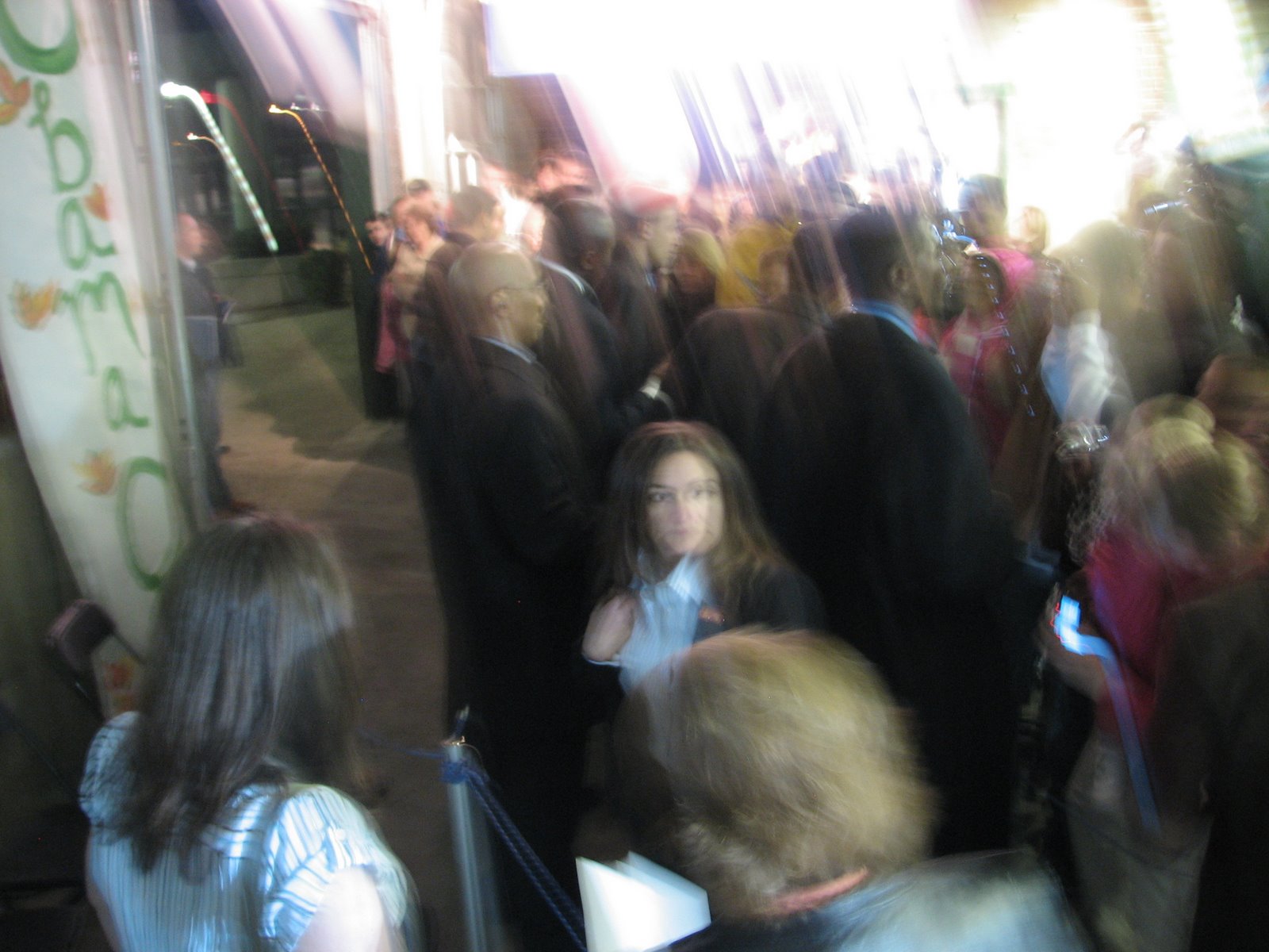There's eight of them surrounding him in this shot. Do you see any of these folks in the arrival picture? See the woman half turned in my direction? Notice how she is between me and Obama at all times?